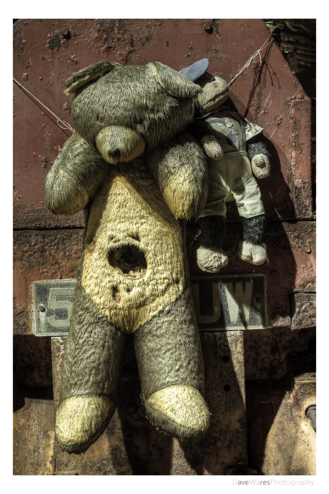 This shot was taken on the beach where fishing boats, net houses(unique to Hastings), bulldozers and various other fishing paraphernalia can be found. These sorry looking teddies were hanging on the back of one of the dozers.