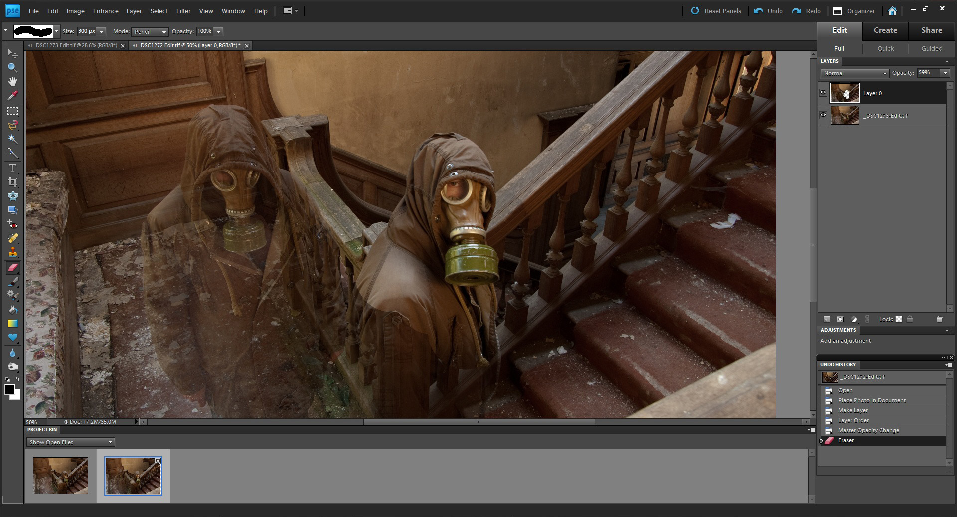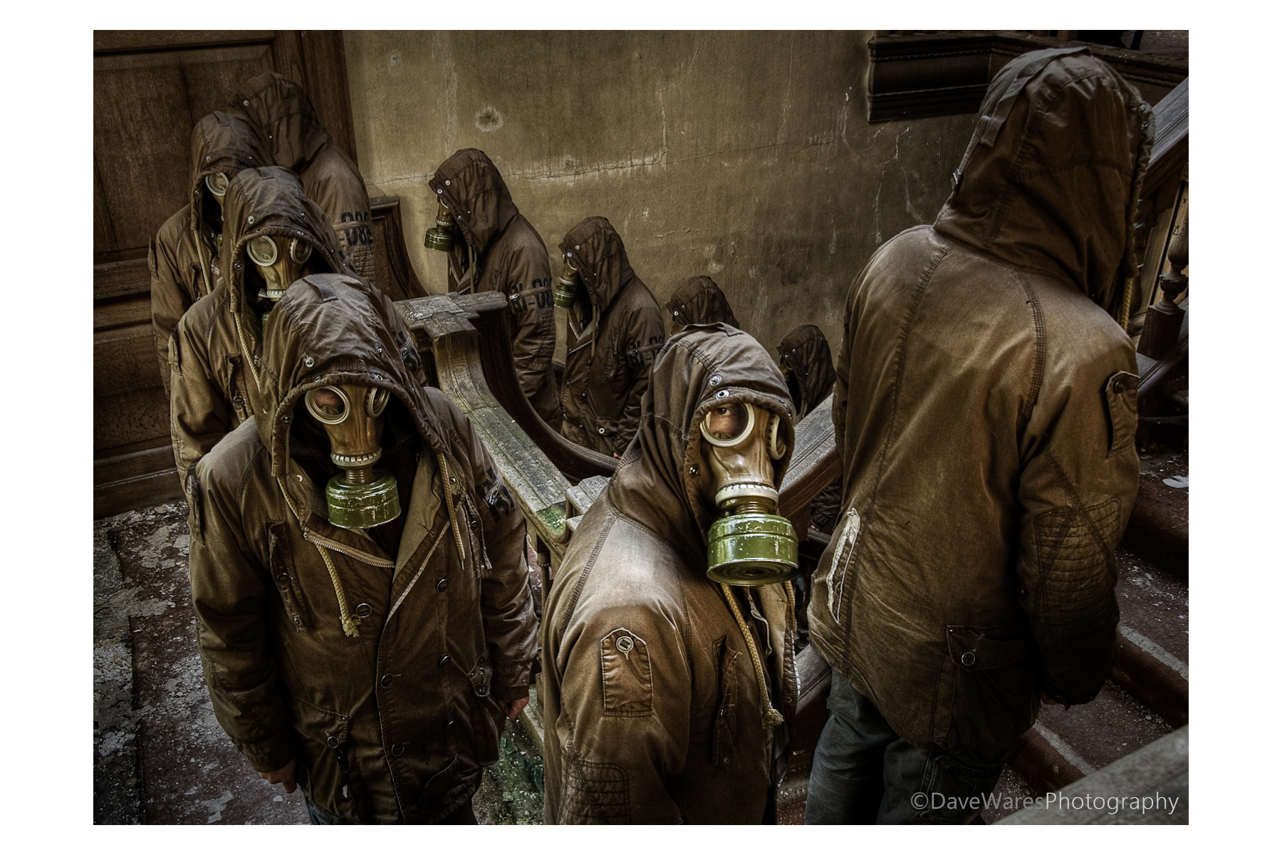 About a year ago (almost to the day) during an urban exploration shoot I took a series of photographs to create a sort of surreal image of a bunch of sinister looking figures ascending the main staircase. That sinister figure was to be me in that ever popular urbex accessory, the gas mask. I had been to this location once before and between visits I was pondering different ways of making an interesting picture. Having knowledge of the location I knew exactly where to place the camera and though my initial thought was to have me on each step, I decided that it would probably become too cluttered and so decided to stand on every other step instead. It wasn’t until a couple of months later that I would actually attempt to put all the shots together.