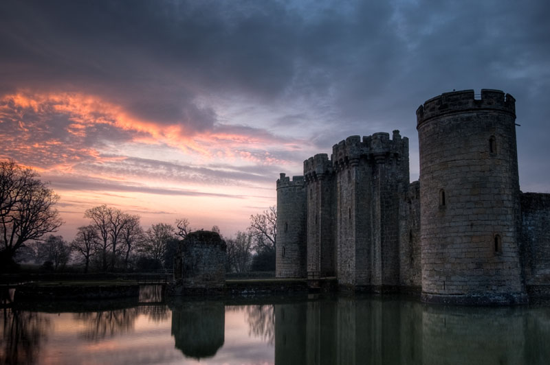 Bodiam Castle shot moments before sunrise giving a lovely orange glow reflected on the clouds.