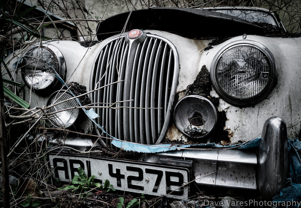 It’s amazing the things you find just wandering around, like this beat up old morris Minor traveller. Walking up one of the side streets on the outskirts of my town I stumbled across a makeshift car parking area, initially all I saw were a few cars of the local residents, however on closer inspection I noticed an old Jag and a couple of Morris Minors. The one you see here was almost totally obscured by the weeds and bushes that surrounded it. I loved the way you can just see the grill and plate with the rest being totally covered. Making this shot mono adds a sense of forlornness.