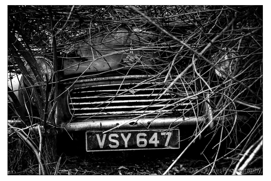 It’s amazing the things you find just wandering around, like this beat up old morris Minor traveller. Walking up one of the side streets on the outskirts of my town I stumbled across a makeshift car parking area, initially all I saw were a few cars of the local residents, however on closer inspection I noticed an old Jag and a couple of Morris Minors. The one you see here was almost totally obscured by the weeds and bushes that surrounded it. I loved the way you can just see the grill and plate with the rest being totally covered. Making this shot mono adds a sense of forlornness.