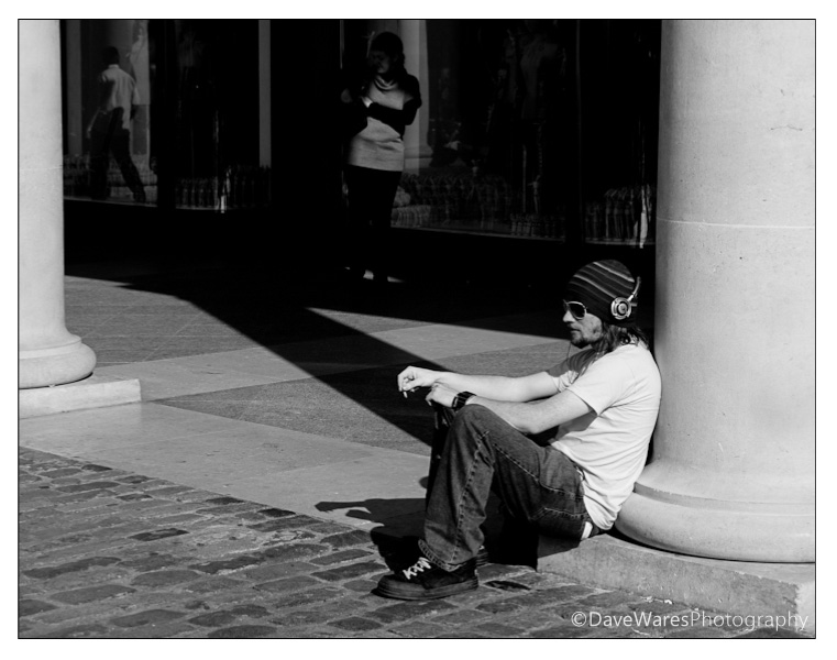 Today’s shot was taken at Covent Garden London on a photo day I took with my cousin Steve. Covent Garden is a great place for photographers who want to hone their people photography skills as it’s such a vibrant and bustling location with lots of things going on at pretty much all hours of the day. Amongst all the hustle and bustle I did manages to spot this fella taking some time out while listening to some sounds and having a wee smoke. I quite like how the harsh light has produced great contrast in the background.